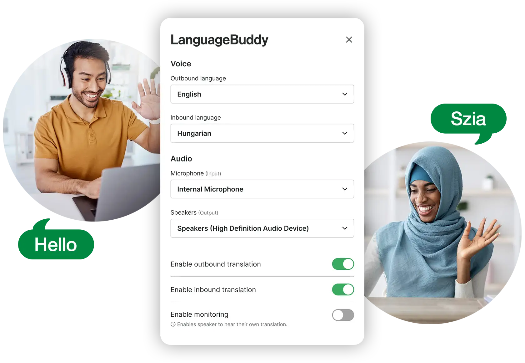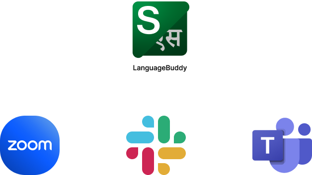 Install LanguageBuddy to your system tray to use it with any communication platform. Just select the LanguageBuddy microphone in your favorite meeting platform and you’ll have instant speech translation for many different languages. It works with Zoom, Slack, Microsoft Teams, Google Meet, and many more.